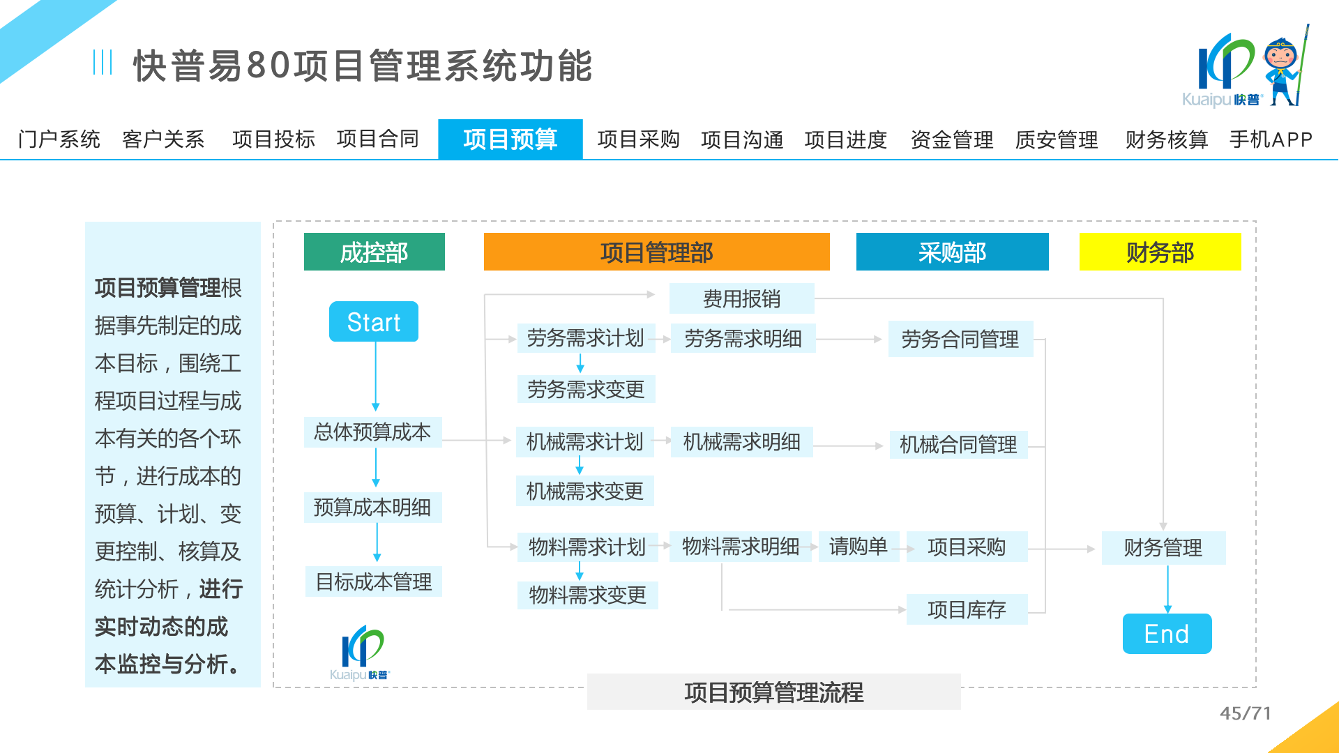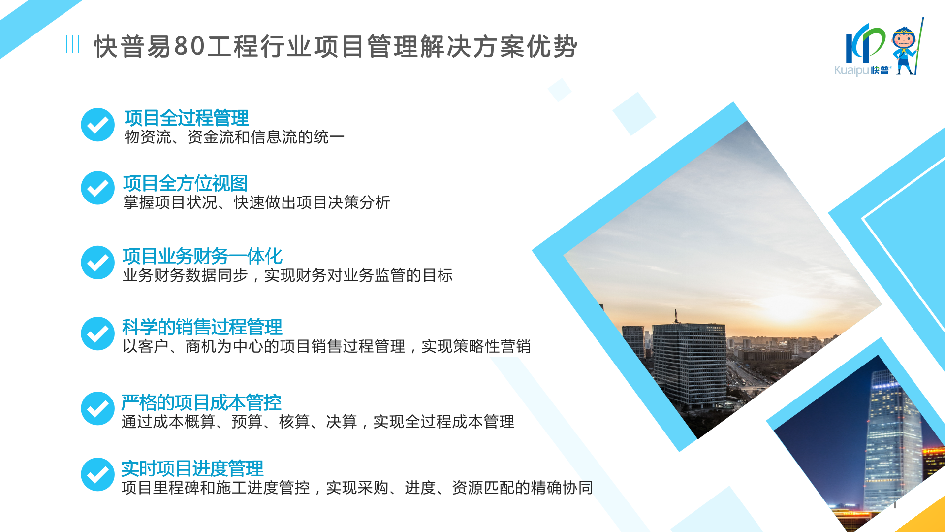 快普易80以項目管理為核心,通過“四控、四管、一協(xié)調(diào)”方式,對項目進度、成本、資金、質(zhì)量安全進行全面控制,實現(xiàn)投標管理、合同管理、物資管理、預算管理等項目全生命周期項目的數(shù)字化管理,實現(xiàn)資源合理配置、保障良好的項目效益。