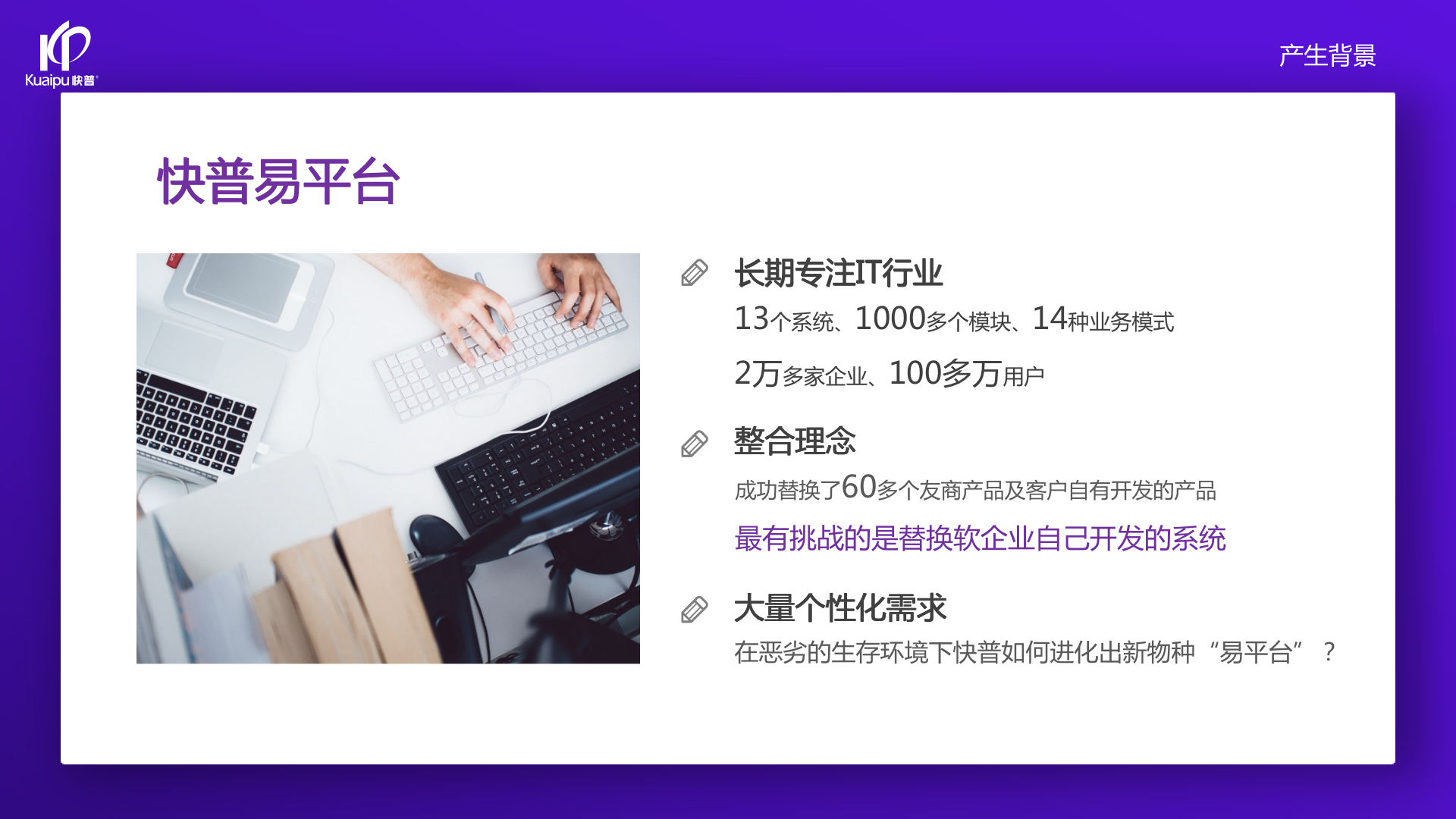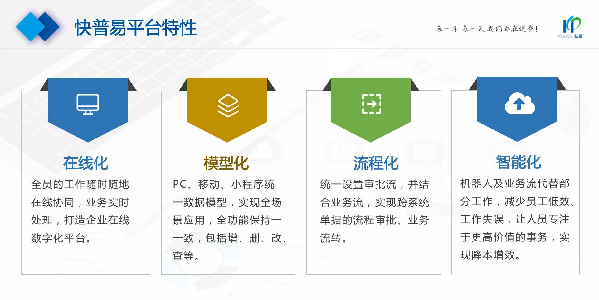 為了解決市場需求與平臺產(chǎn)品瓶頸等矛盾,實(shí)現(xiàn)徹底的零代碼平臺,快普堅(jiān)持理念創(chuàng)新,以理念推動平臺技術(shù)的創(chuàng)新?!耙圆蛔儜?yīng)萬變”的理念:分析哪些東西未來肯定不變?哪些趨勢未來一定會變?從變化中找出不變的因素,從不變中找出變動的因素;從量變到質(zhì)變,經(jīng)歷萬變總結(jié)抽象出不變的本質(zhì)?;诳炱臻L期的信息化服務(wù)經(jīng)驗(yàn),開發(fā)配置出企業(yè)數(shù)字化轉(zhuǎn)型工具:快普易平臺成功解決了企業(yè)數(shù)字化轉(zhuǎn)型升級面臨的客戶大量個性化需求,真正實(shí)現(xiàn)隨需而變的設(shè)計理念,大大降低了信息化投入成本,提高信息化效率,幫助企業(yè)實(shí)現(xiàn)自主可控的技術(shù)創(chuàng)新,從而進(jìn)一步推動企業(yè)的業(yè)務(wù)創(chuàng)新和管理創(chuàng)新。