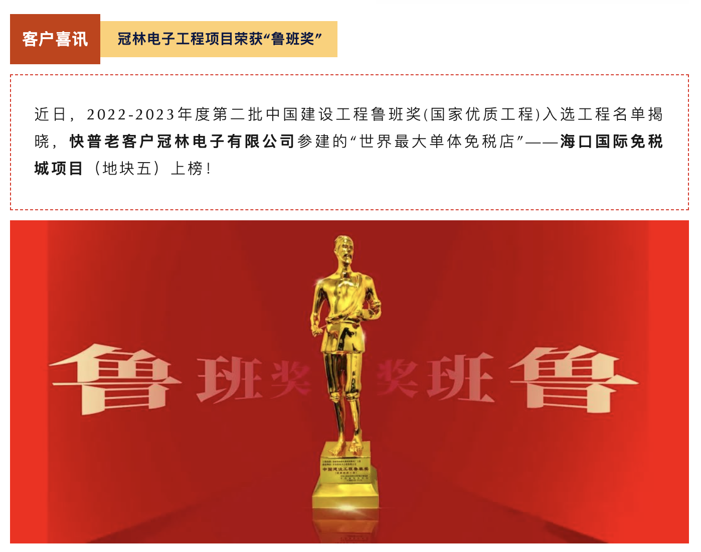 中國建設(shè)工程魯班獎(國家優(yōu)質(zhì)工程)是由中華人民共和國住房和城鄉(xiāng)建設(shè)部指導、中國建筑業(yè)協(xié)會實施評選的獎項,是中國建筑行業(yè)工程質(zhì)量最高榮譽獎,被譽為中國建筑業(yè)的“奧斯卡”,主要授予中國境內(nèi)已經(jīng)建成并投入使用的各類新(擴)建工程,且工程質(zhì)量應(yīng)達到國內(nèi)領(lǐng)先水平。